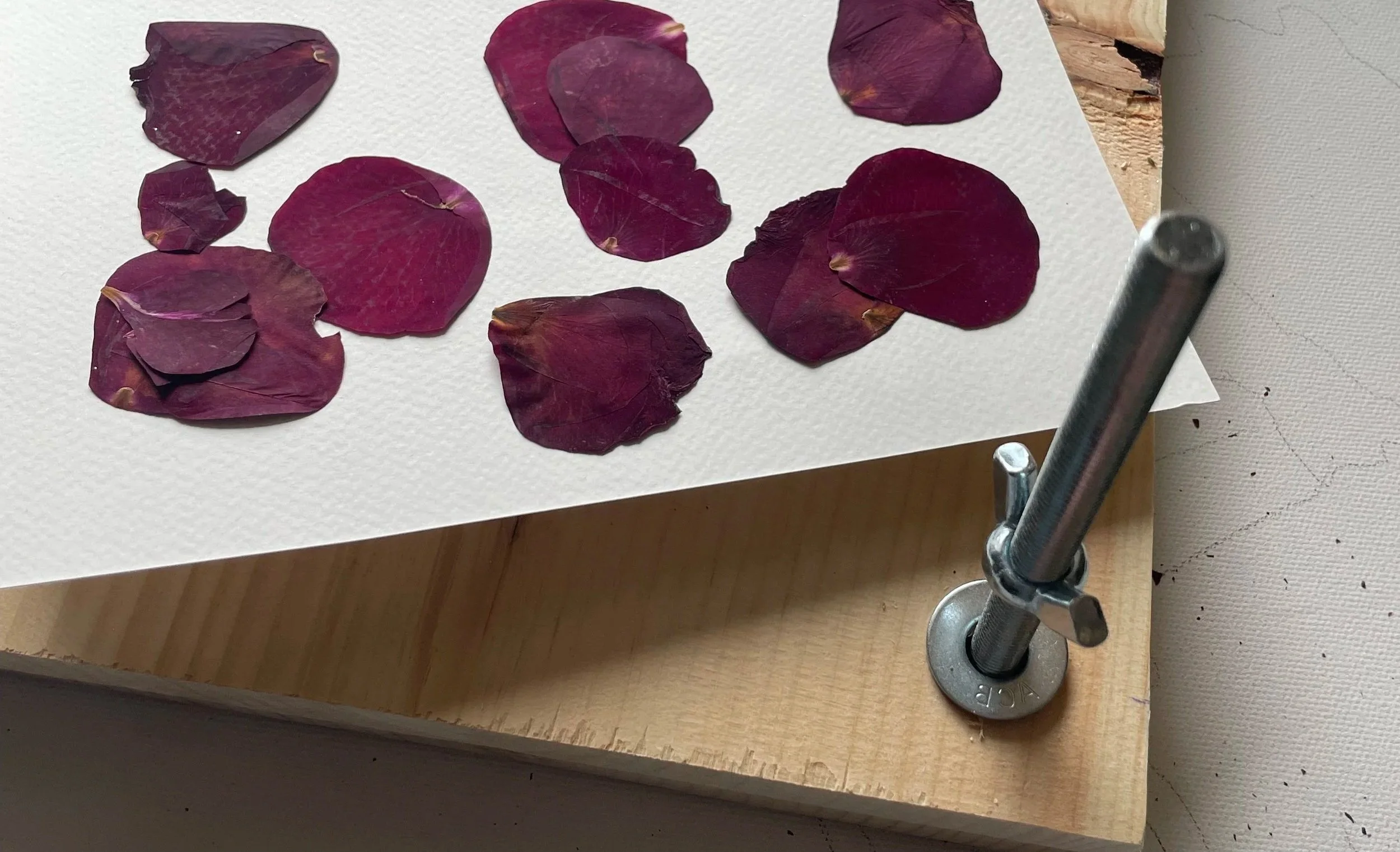 Prior to being arranged on the canvas and painted over, some petals are carefully dried and pressed before acrylic paint is applied.